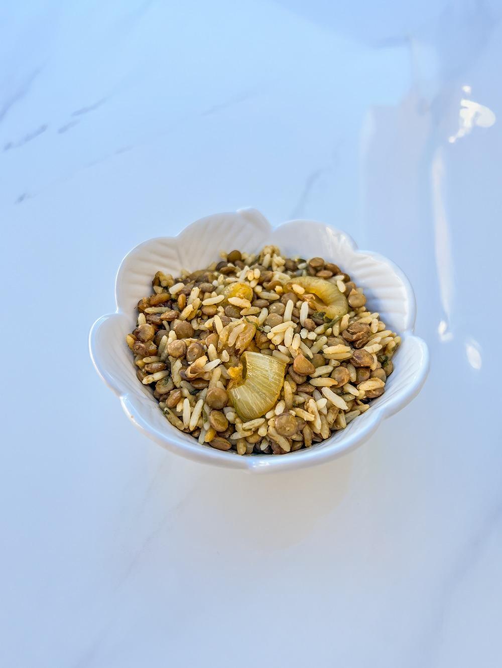 Arroz sírio temperado com lentilha e cebola caramelizada.
