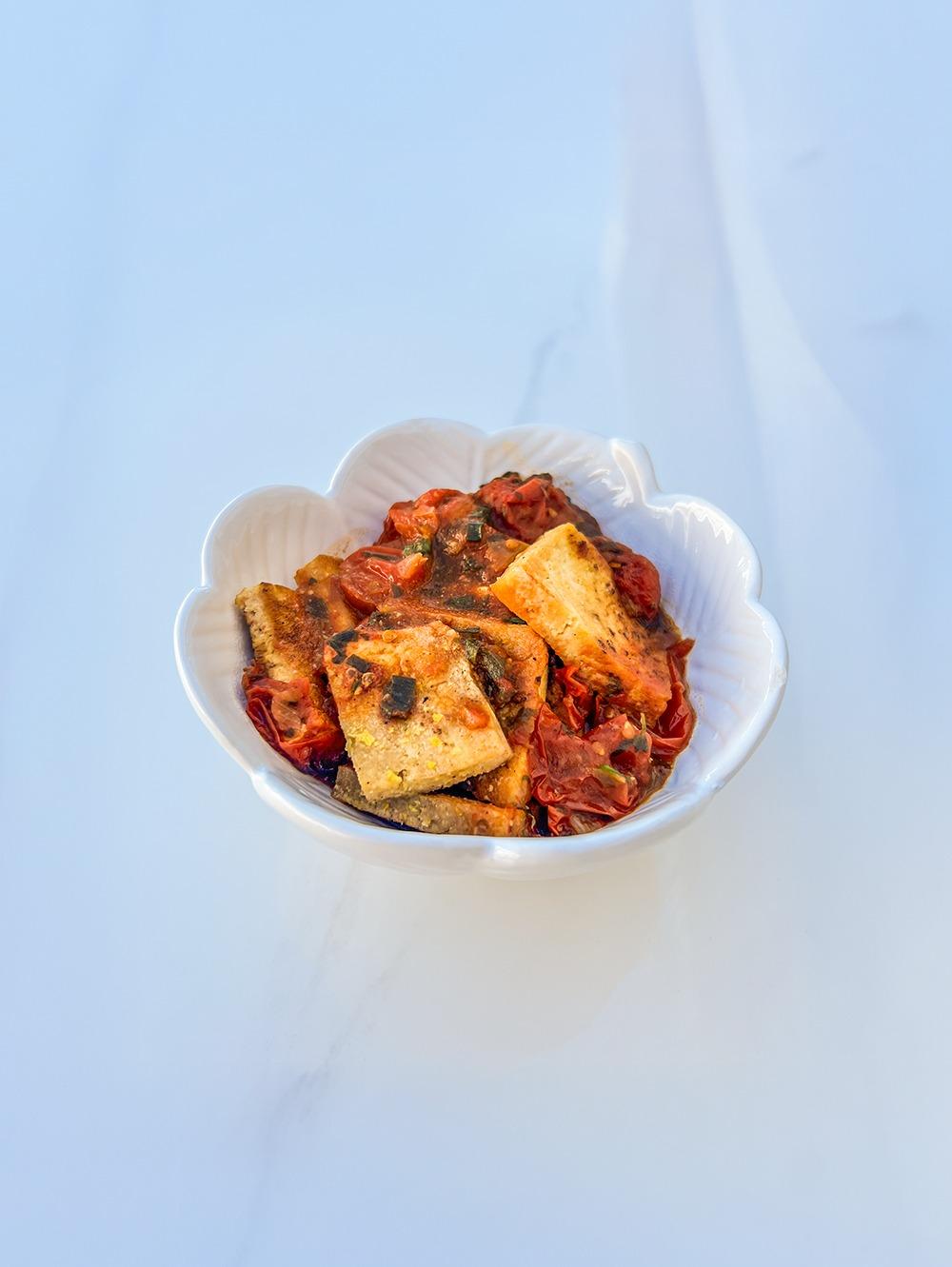 Uai tofu frescal selado na frigideira e enriquecido com levedura nutricional acompanhando molhinho agridoce de tomatinho cereja com melado de cana.