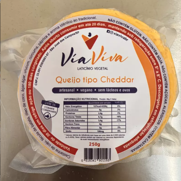 Ingredientes: castanha de caju, água, óleo de coco, fécula de batata, rejuvelac, sal, agar agar, páprica defumada, urucum puro e aroma idêntico ao cheddar.