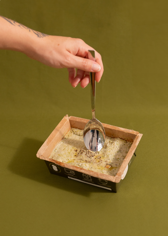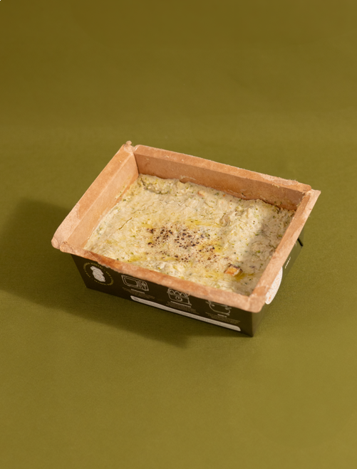 Massa de sêmola intercalada com molho bechamel caseiro feito com couve-flor, uai tofu frescal, biomassa, leite de pepitas de girassol (receita da casa), brócolis japonês e uai tofu defumado fritinho "tipo bacon".