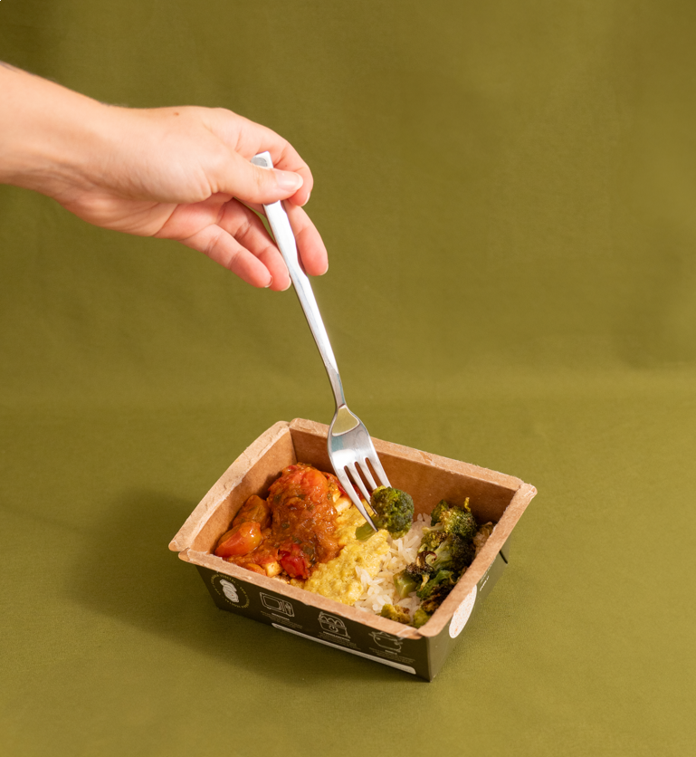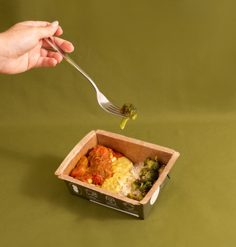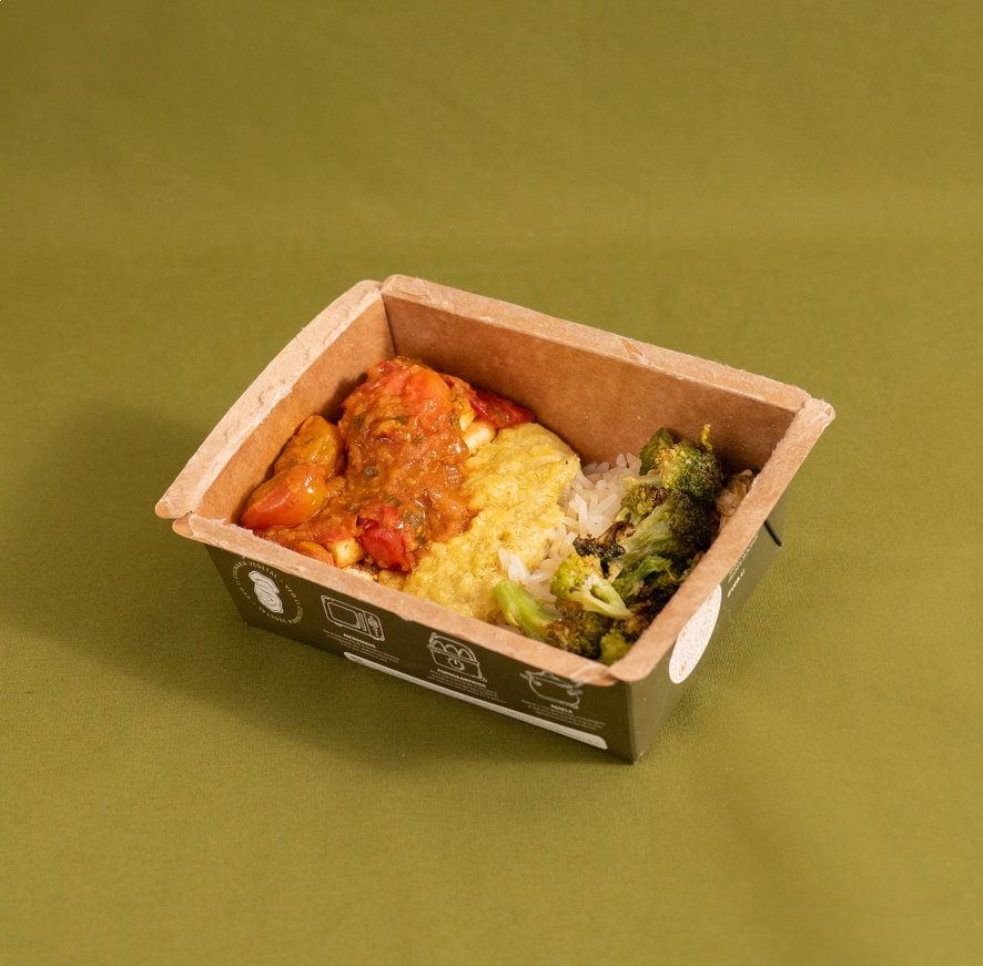 Arroz branco soltinho + creme de milho in natura feito com creme de leite caseiro de pepitas de girassol + brócolis japonês assado com azeite e alho + Uai Tofu frescal selado na frigideira e enriquecido com levedura nutricional + tomatinho cereja agridoce feito com melado de cana.