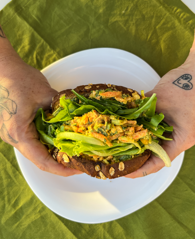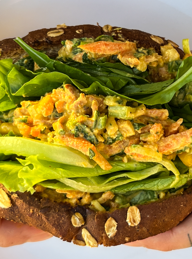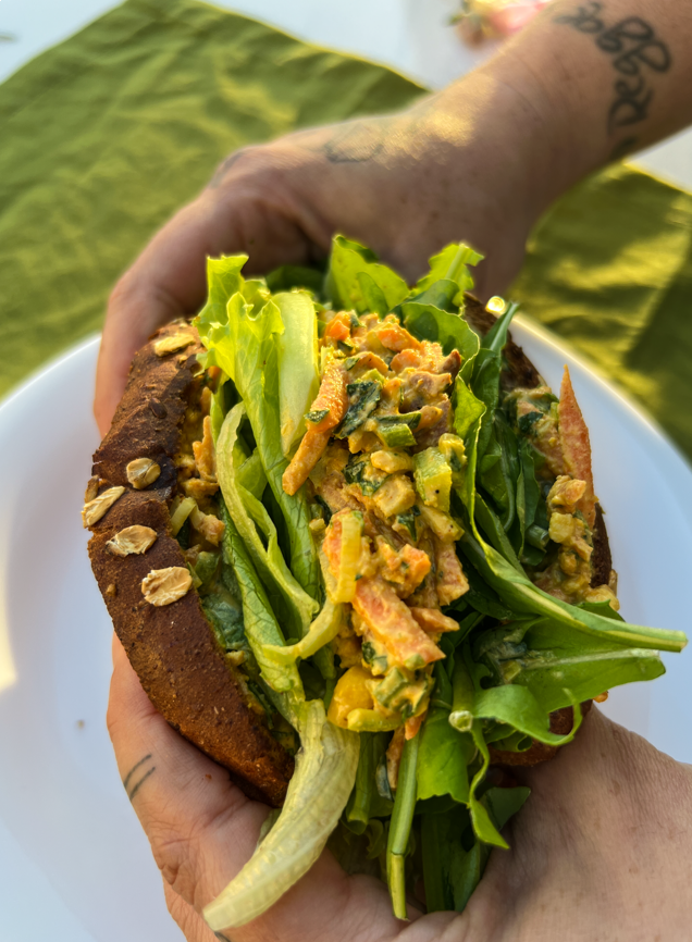 Pão integral selado no azeite beeeem recheadão com patê de uai tofu defumado feito com maionese caseira de castanha de caju e tofu frescal, cenoura ralada, milho e muitos temperinhos naturais!