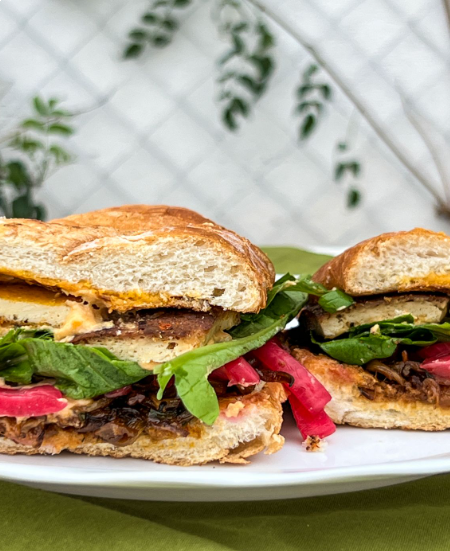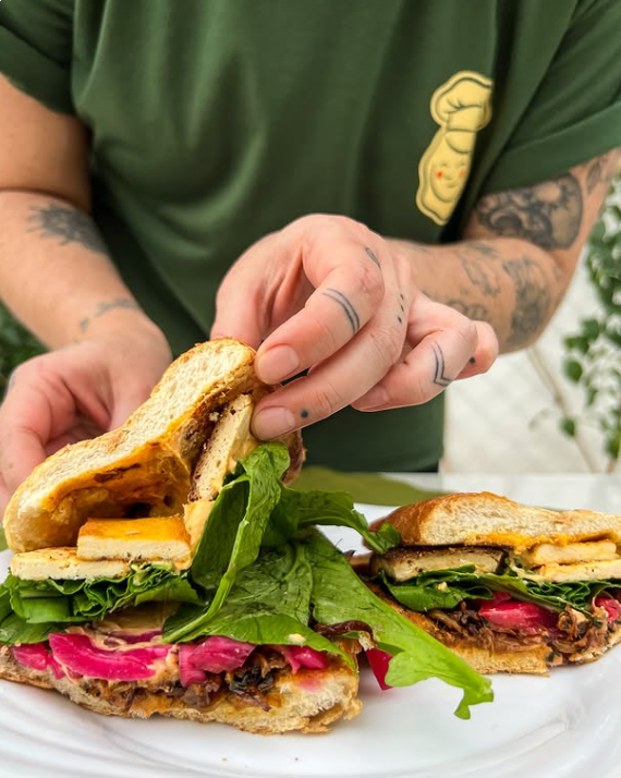 Super baguete recheada com cheddar fermentado de castanha de caju, shimeji agridoce feito no melado de cana, picles de cebola roxa, tofu defumado e rúcula orgânica.
