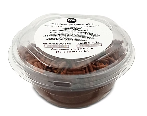 Ingredientes: Leite condensado POP (açúcar, xarope de glucose,gordura de palma, extrato de soja*, lecitina de soja* (AgrobacteriumTumefaciens), açúcar, extrato de soja, chocolate meio amargo, creme de soja e chocolate granulado.