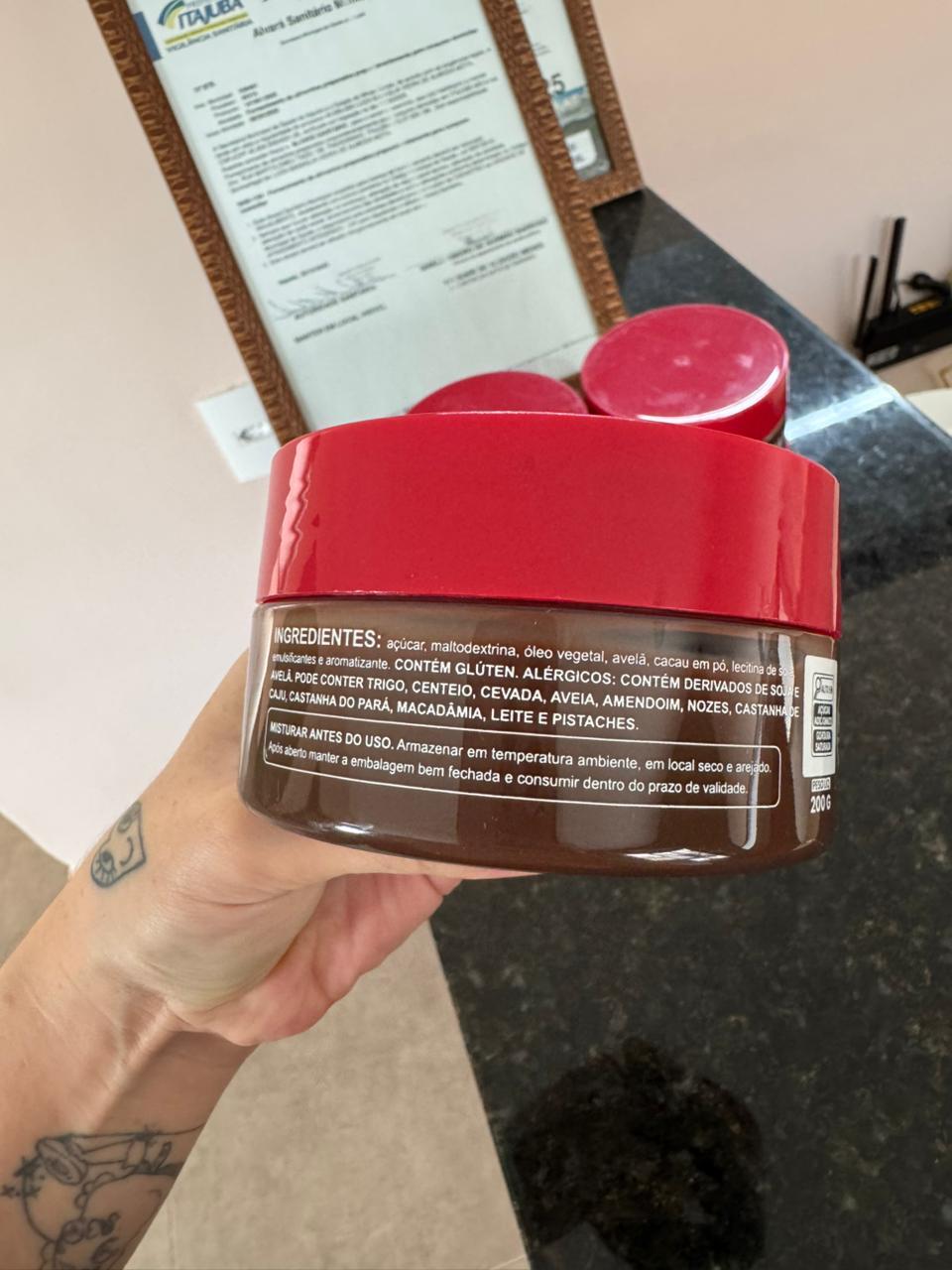 Ingredientes: açúcar, maltodextrina, óleo vegetal, avelã, cacau em pó, lecitina de soja, emulsificantes e aromatizantes.
