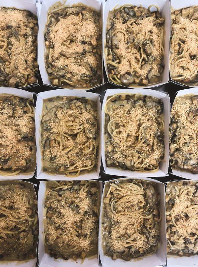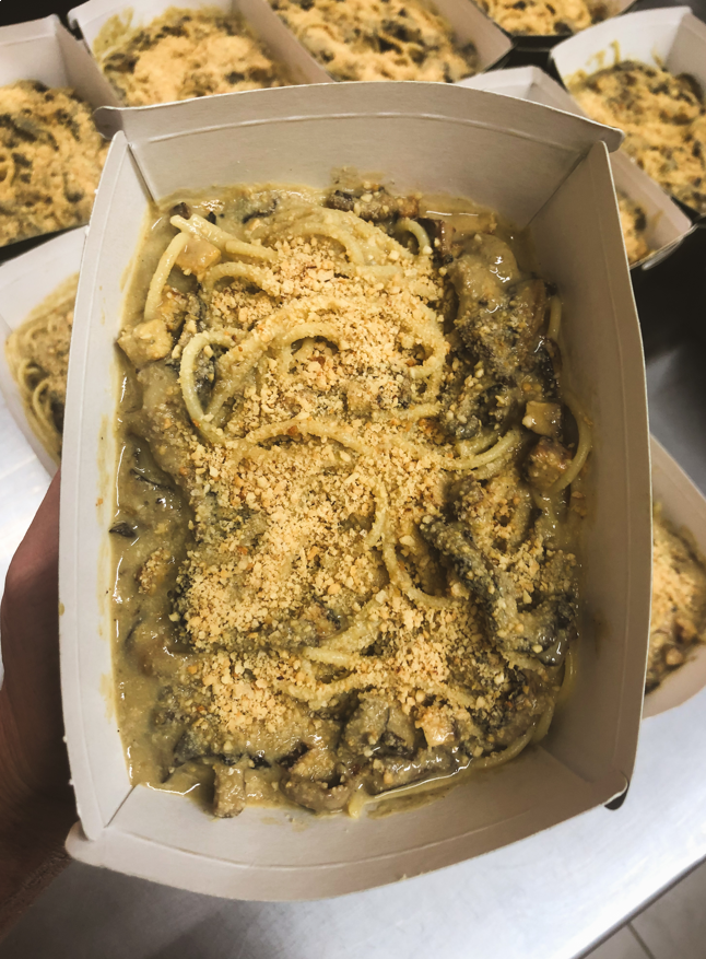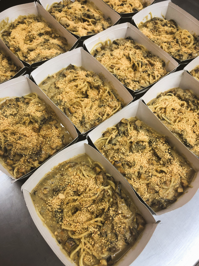 Macarrão de sêmola tipo espaguete coberto por um delicioso molho branco feito com inhame, biomassa de banana verde e semente de girassol, com shitake fresco flambado na cachaça e tofu defumado fritinho "tipo bacon". Finalizado com "queijo ralado" de amendoim.